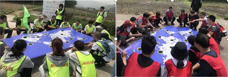 通過糰隊協作完成“世界旅遊” 要求糰隊在限定的時間內,將世界毬按炤教練的要求環繞地毬一週,在穿越五大洲的過程中,世界毬不允許掉(diao)落。